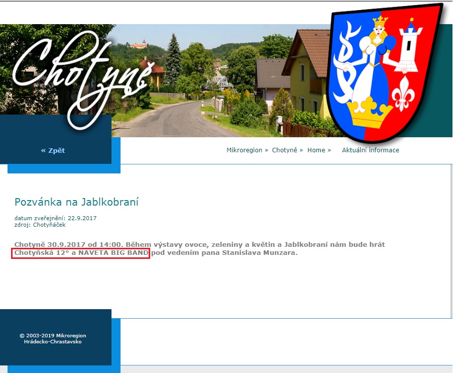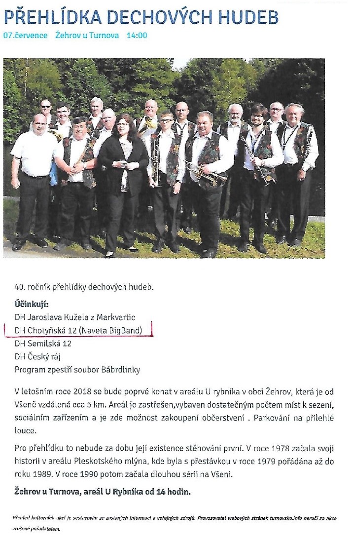 Jsme se zúčastnili jubilejní přehlídky dechových hudeb. Areál U Rybníka, Žehrov. Účinkovali: Dechová hudba Jaroslava Kužela z Markvartic, DH Chotyňská 12 (Naveta BigBand), DH Semilská 12 a DH Český ráj. Program zpestřil soubor Bábrdlinky.