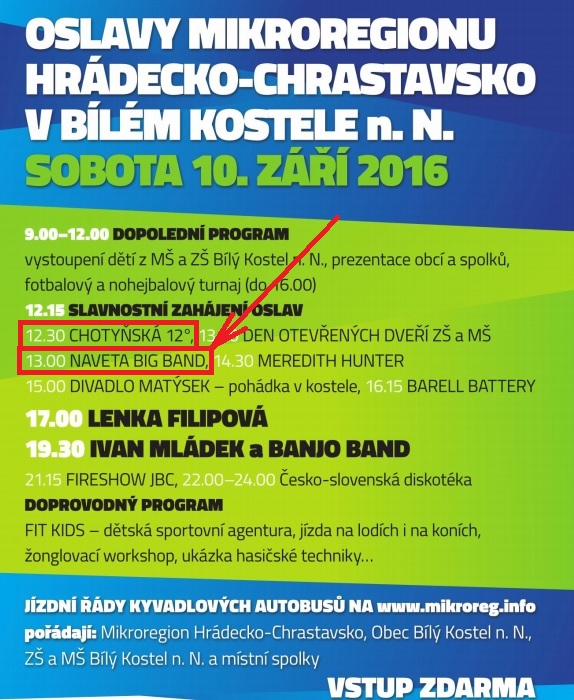 "Předskokanem" od 16 hodin bude NAVETA BIG BAND se svými zpěváky a sólisty, hrající celé spektrum melodií od nádherného starého swingu Glenna Millera, přes české filmové melodie známé z podání Oldřicha Nového, Inky Zemánkové, Arnošta Kavky a dalších, nestárnoucí hity divadla Semafor Jiřích Šlitra a Suchého "melodie věčně zelené", až po zajímavé úpravy "lidovek" slavného liberečana Karla Vacka.